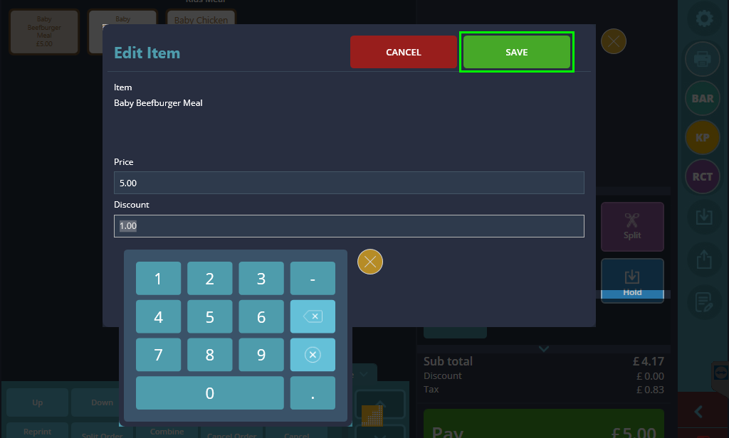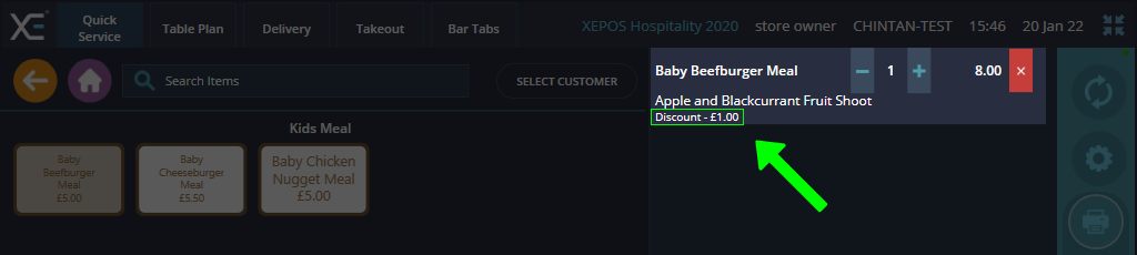 You should now see a price change or discount applied under the selected item, indicating the change was successful and will now be applied to the total amount of the order.