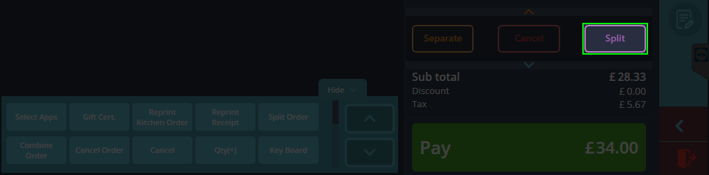 Once you have your desired items in the cart and would like to split the order, simply navigate underneath the cart and press Split located beside the Cancel button.