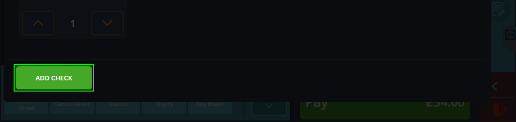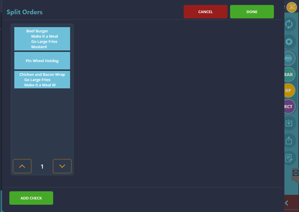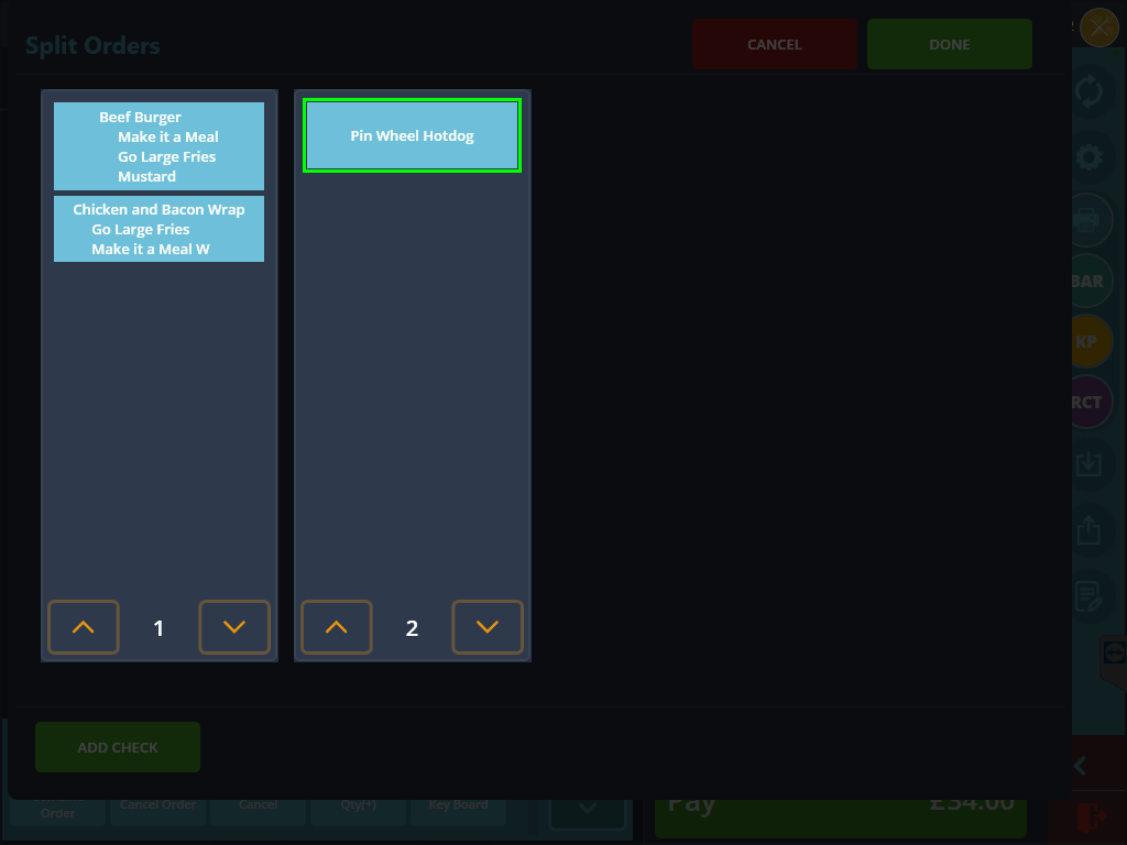 Once the window is open, you will find a single check currently holding all of the items on the order. The aim is to move these over to seperate checks so your customers can pay the correct amount on the correct items. Before doing this you must add an empty check, you can add however many is necessary for the split. Simply press ADD CHECK on the bottom left of the window. Another empty check will come up on the right. As you add more checks, they will be numbered chronologically down below.